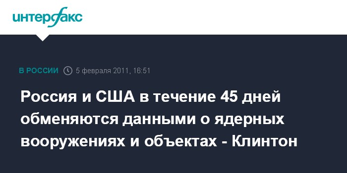 Мюнхен. 5 февраля. INTERFAX.RU - Россия и США в течение полутора месяцев должны обменяться всей информацией о своих ядерных арсеналах и объектах, заявила госсекретарь США Хиллари Клинтон. "В течение 45 дней мы обменяемся полной информацией о наших вооружениях и объектах", - сказала она в субботу на пресс-конференции после обмена ратификационными грамотами по СНВ. "В течение 60 дней мы возобновим инспекции", - добавила госсекретарь.