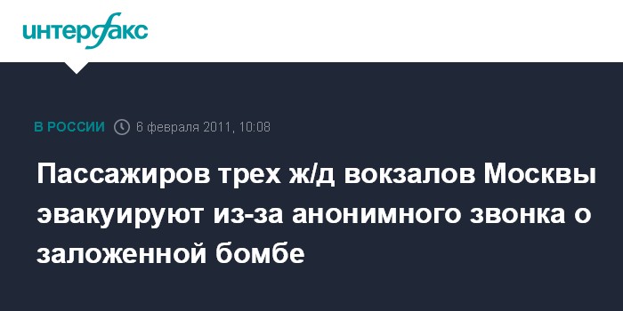 Москва. 6 февраля. INTERFAX.RU - Неизвестный, позвонив в милицию, сообщил о заложенных бомбах на нескольких столичных железнодорожных вокзалах. "В 09:02 на пульт "02" позвонил неизвестный мужчина и сообщил, что заминированы три вокзала, которые вскоре взлетят на воздух", - сообщила "Интерфаксу" руководитель пресс-службы Управления на транспорте МВД России по ЦФО Татьяна Агапова. Она подчеркнула, что звонивший не уточнил, какие из вокзалов заминированы, поэтому спецмероприятия проводятся на всех девяти вокзалах столицы.