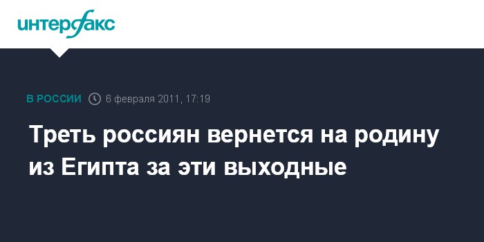 Москва. 6 февраля. INTERFAX.RU - Примерно треть россиян от общего числа отдыхающих в Хургаде и Шарм-Эль-Шейхе вернется домой за эти выходные, сообщила в воскресенье порталу "Интерфакс-Туризм" исполнительный директор Ассоциации туроператоров России (АТОР) Майя Ломидзе.