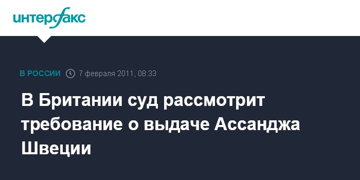 Лондон. 7 февраля. INTERFAX.RU - Британский суд назначил слушание по требованию Швеции об экстрадиции основателя сайта Wikileaks Джулиана Ассанджа на 7-8 февраля.