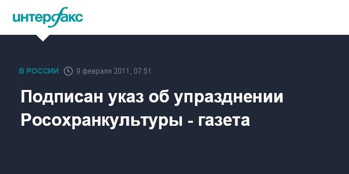 Москва. 9 февраля. ИНТЕРФАКС - Президент России Дмитрий Медведев подписал указ об упразднении Федеральной службы по надзору за соблюдением законодательства в области охраны культурного наследия (Росохранкультура) и передаче ее функций министерству культуры, пишет в среду газета "Коммерсант".