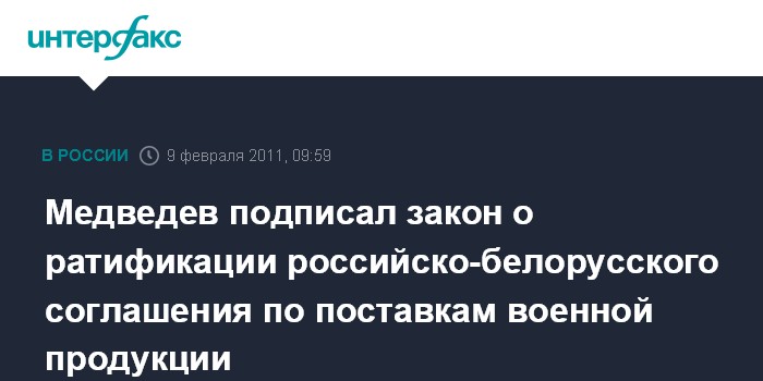 Москва. 9 февраля. INTERFAX.RU - Президент России Дмитрий Медведев подписал федеральный закон "О ратификации соглашения между правительством Российской Федерации и правительством Республики Беларусь об обеспечении взаимных поставок продукции военного, двойного и гражданского назначения в период нарастания угрозы агрессии и в военное время", сообщает в среду пресс-служба Кремля.