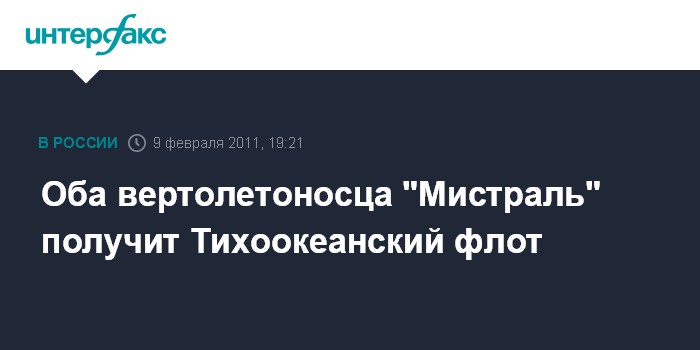 Москва. 9 февраля. INTERFAX.RU - Оба вертолетоносца "Мистраль", которые Россия планирует закупить у Франции, будут поставлены на вооружение Тихоокеанского флота, сообщил "Интерфаксу" в среду высокопоставленный источник в Минобороны РФ.