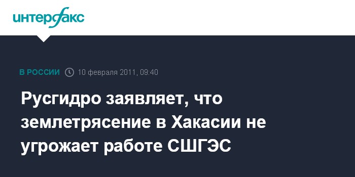 Москва. 10 февраля. INTERFAX.RU - Землетрясение, зафиксированное в Хакасии, не угрожает безопасности Саяно-Шушенской ГЭС и ее плотины, сообщили "Интерфаксу" в пресс-службе ОАО "Русгидро".