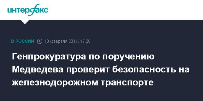 Москва. 10 февраля. INTERFAX.RU - Президент РФ Дмитрий Медведев поручил генпрокурору Юрию Чайке проверить, как обеспечивается безопасность на железных дорогах и соблюдается транспортное законодательство.