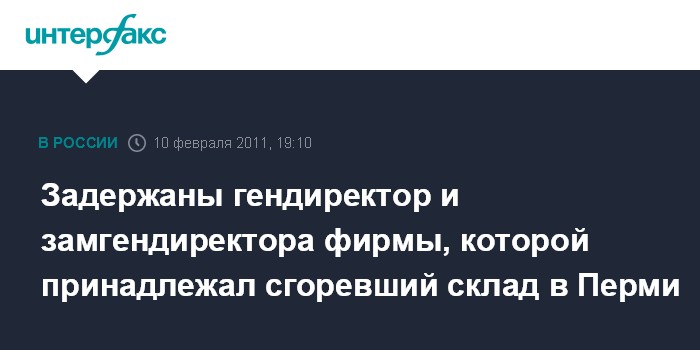 Москва. 10 февраля. INTERFAX.RU - В Перми задержаны гендиректор и заместитель гендиректора ООО "Кама-Трейд", которому принадлежал сгоревший склад бытовой химии, сообщили "Интерфаксу" в СК РФ.