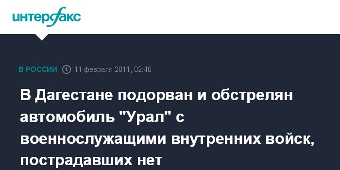 "Около 22:00 мск в четверг на автодороге Кизляр - Кориновка сработало взрывное устройство в момент прохождения бронированного "Урала" с военнослужащими внутренних войск, которые следовали для охраны железнодорожного полотна", - сказал собеседник агентства.