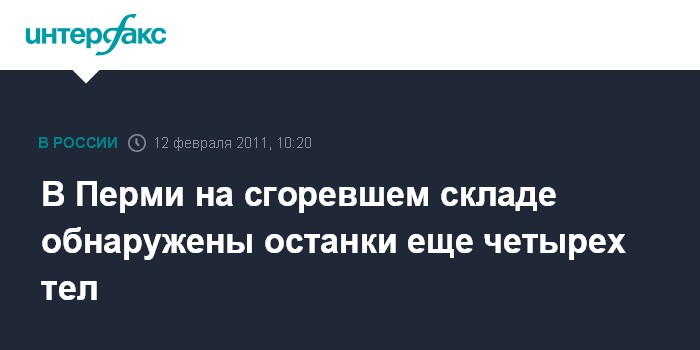 Пермь. 12 февраля. INTERFAX.RU - В Перми в ходе проведения осмотра склада, где в четверг произошел пожар, следователям удалось обнаружить под завалами останки человеческих тел. "Следователи обнаружили под завалами останки четырех человеческих тел", - сообщает пресс-служба следственного управления СКР по Пермскому краю в субботу.