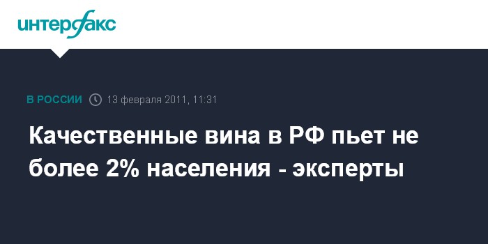 Москва. 13 февраля. INTERFAX.RU - Качественные вина в России пьет не более 2% населения. Как сообщил "Интерфаксу" председатель экспертного совета по вопросам госрегулирования производства и оборота этилового спирта, алкогольной и спиртосодержащей продукции комитета Госдумы по экономической политике и предпринимательству Михаил Блинов, такую оценку сделали эксперты Ассоциации импортеров вин.