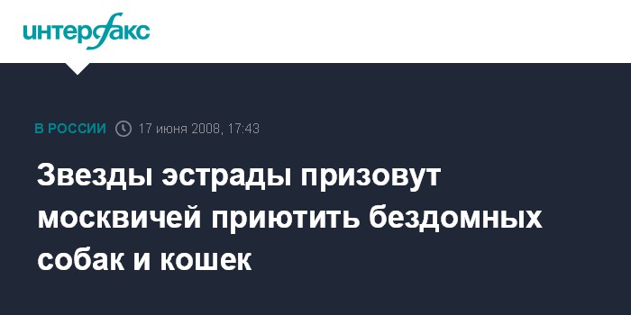 Москва. 17 июня. INTERFAX.RU - Плакаты с изображением звезд российской эстрады, призывающих москвичей забирать собак и кошек из приютов, планируется разместить в ближайшее время в московском метро, сообщили в Центре защиты прав животных "Вита". "В московском метро будет висеть реклама, призывающая наших граждан брать животных из приютов", - рассказала президент центра Ирина Новожилова на пресс-конференции в центральном офисе "Интерфакса", отметив, что целесообразнее запустить проект не летом, когда многие находятся в отпусках, а в сентябре.