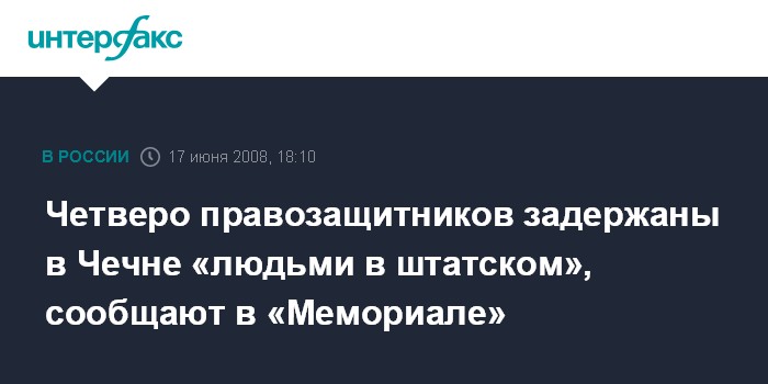 Москва. 17 июня. INTERFAX.RU - В Чечне задержаны четверо сотрудников правозащитного центра "Мемориал" - ведущей российской неправительственной организации, которая специализируется на мониторинге ситуации с правами человека на Северном Кавказе. "Мы сильно обеспокоены этим инцидентом", - сказал "Интерфаксу" член совета центра "Мемориала" Александр Черкасов.