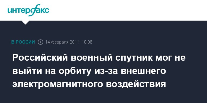 Москва. 14 февраля. INTERFAX.RU - Сбой автоматики разгонного блока "Бриз-КМ", который привел к выведению не на ту орбиту военного геодезического спутника "Гео-ИК-2", мог быть вызван внешним электромагнитным воздействием на "разгонник", сообщил "Интерфаксу" информированный источник в российской космической отрасли.