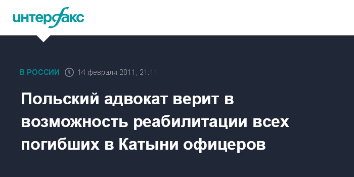 По мнению адвоката, высказывания которого приводит в понедельник польское радио, все 22 тыс. офицеров, расстрелянных весной 1940 года, могут быть реабилитированы, несмотря на то, что некоторые документы, которые могут потребоваться во время этого процесса, утеряны.