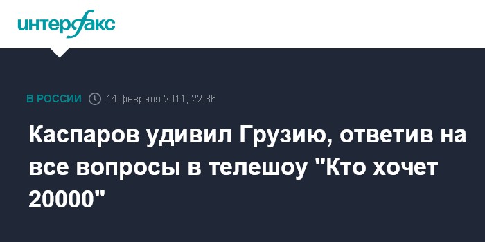 Тбилиси. 14 февраля. ИНТЕРФАКС - Российский оппозиционер и известный шахматист Гарри Каспаров в Тбилиси принял участие в интеллектуальном телешоу грузинской телекомпании "Рустави-2" "Кто хочет 20000" и победил, отгадав ответы на все 15 вопросов.