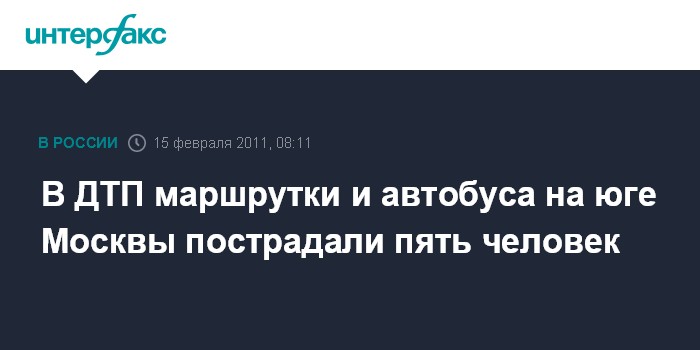 Москва. 15 февраля. INTERFAX.RU - На юге Москвы вечером в понедельник столкнулись автобус и маршрутное такси, пострадали пять человек, сообщил "Интерфаксу" источник в правоохранительных органах.
