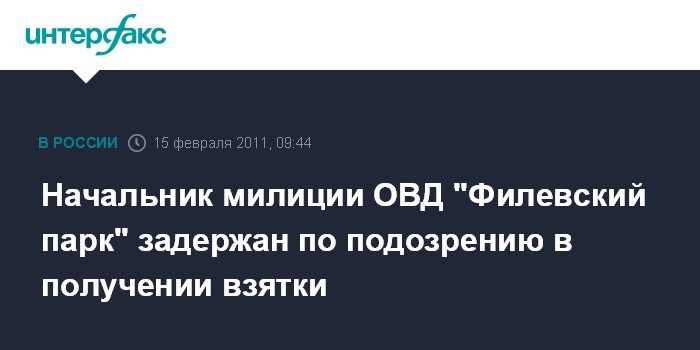 Москва. 15 февраля. INTERFAX.RU - В Москве задержан начальник ОВД "Филевский парк" по подозрению в получении взятки, сообщил "Интерфаксу" источник в правоохранительных органах во вторник.