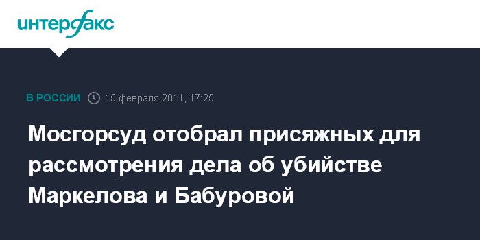 Москва. 15 февраля. INTERFAX.RU - Мосгорсуд сформировал коллегию присяжных для рассмотрения дела об убийстве адвоката Станислава Маркелова и журналистки Анастасии Бабуровой.