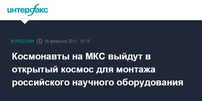 Москва. 16 февраля. INTRFAX.RU - Российские космонавты Дмитрий Кондратьев и Олег Скрипочка в среду осуществят выход в открытый космос с борта Международной космической станции (МКС) для установки научной аппаратуры на ее внешней поверхности, сообщил "Интерфаксу" руководитель пресс-службы подмосковного Центра управления полетами (ЦУП) Валерий Лындин.