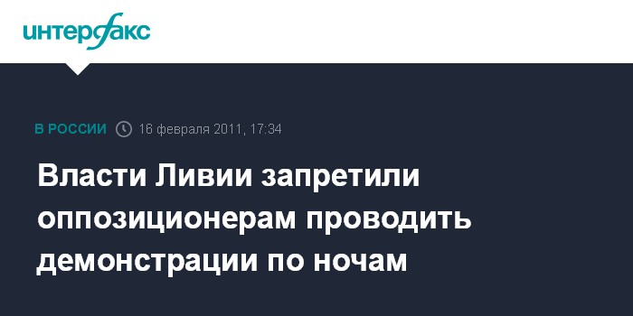 Лондон. 16 февраля. INTERFAX.RU - Ливийское руководство сообщило, что запрещает сторонникам оппозиции проводить демонстрации в ночное время суток, сообщила в среду британская телерадиокорпорация BBC. "Мы не позволим группам людей выходить на улицу по ночам и ставить под угрозу безопасность Ливии", - отмечается в заявлении правительства.