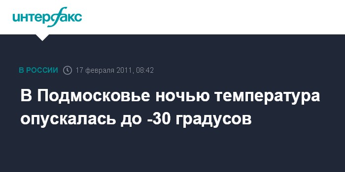 Москва.17 февраля. INTERFAX.RU - Ночь на 17 февраля стала самой холодной нынешней зимой, температура в Московской области опускалась до 30-градусных значений, сообщили "Интерфаксу" в Гидрометеобюро Москвы и Московской области.
