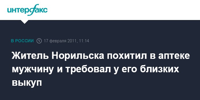 Новосибирск. 17 февраля. INTERFAX.RU - Норильский следственный отдел следственного управления СКР по Красноярскому краю возбудил уголовное дело в отношении 25-летнего местного жителя по факту похищения человека.