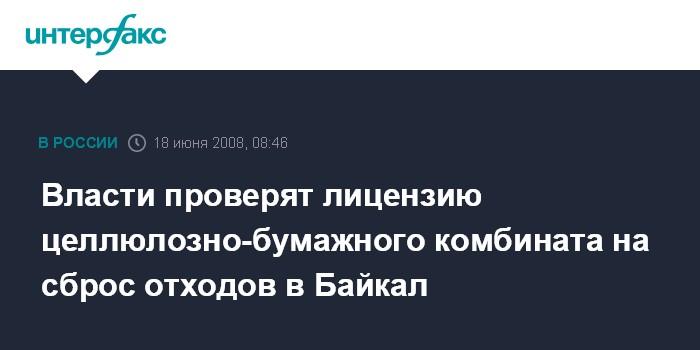 Новосибирск. 18 июня. INTERFAX.RU - Ростехнадзор намерен уточнить, при каких обстоятельствах Байкальскому ЦБК было выдано разрешение на сброс в озеро Байкал загрязняющих веществ. Об этом сообщил журналистам руководитель Межрегионального территориального управления Ростехнадзора по Сибирскому федеральному округу Леонид Баклицкий.