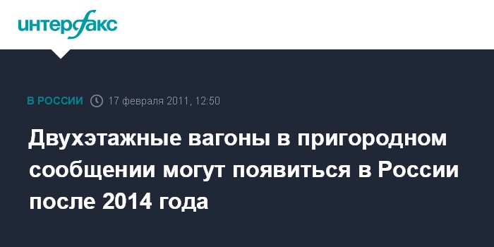 Москва. 17 февраля. INTERFAX.RU - Двухэтажные пассажирские вагоны на локомотивной тяге могут появиться в РФ после 2014 года в пригородном железнодорожном сообщении на дальних и межобластных маршрутах и только на протяженных маршрутах, сообщил журналистам начальник департамента пассажирских сообщений ОАО "Российские железные дороги" (РЖД) Геннадий Верховых.