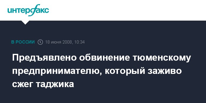 Тюмень. 18 июня. INTERFAX.RU - Жителю Тюмени, 37-летнему предпринимателю Юрию Вергунову, предъявлено обвинение в убийстве гражданина Таджикистана с особой жестокостью.