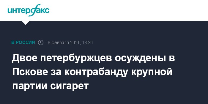 Псков. 18 февраля. INTERFAX.RU - В Пскове осуждены контрабандисты, пытавшиеся перевезти через российско-латвийскую границу крупную партию сигарет стоимостью 5,5 млн рублей.
