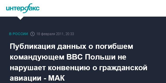 Москва.18 февраля. INTERFAX.RU - МАК не усматривает нарушений положений Чикагской конвенции о гражданской авиации в обнародовании данных о погибшем в авиакатастрофе под Смоленском командующим ВВС Польши Анджее Бласике.