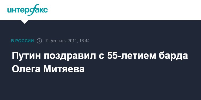 Москва. 19 февраля. INTERFAX.RU - Премьер-министр России Владимир Путин поздравил известного музыканта, автора и исполнителя бардовской песни Олега Митяева с 55-летием со дня рождения. "Своим творчеством вы продолжили и значительно обогатили замечательные традиции бардовской песни, вписали яркие строки в музыкально-поэтическую историю этого жанра", - говорится в поздравительной телеграмме, текст которой размещен на сайте правительства в субботу.