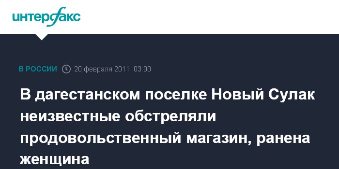 Ростов-на-Дону. 20 февраля. ИНТЕРФАКС-ЮГ - Продовольственный магазин обстрелян из автоматического оружия в поселке Новый Сулак Кизилюртовского района Дагестана.