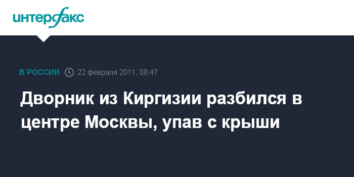 По его словам, в понедельник днем дворник-гастарбайтер упал с кровли дома 29 корп.2 по Тверской улице. "В результате полученных травм 27-летний гражданин Киргизии скончался на месте", - сказал собеседник агентства.