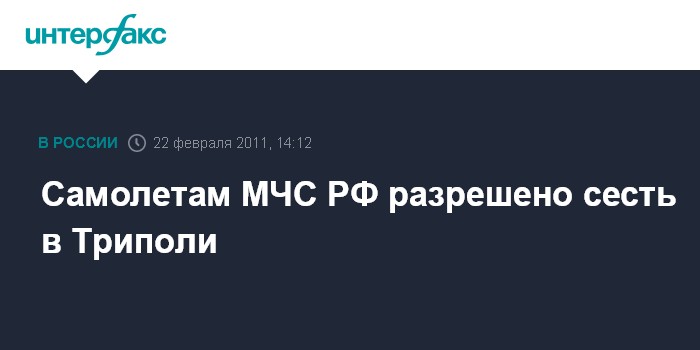 Москва. 22 февраля. INTERFAX.RU - Ливия дала разрешение на посадку самолетов МЧС в Триполи для эвакуации россиян, сообщил посол РФ в Ливии Владимир Чамов по телефону на селекторном заседании межведомственного оперативного штаба, которое провел глава МЧС РФ Сергей Шойгу.