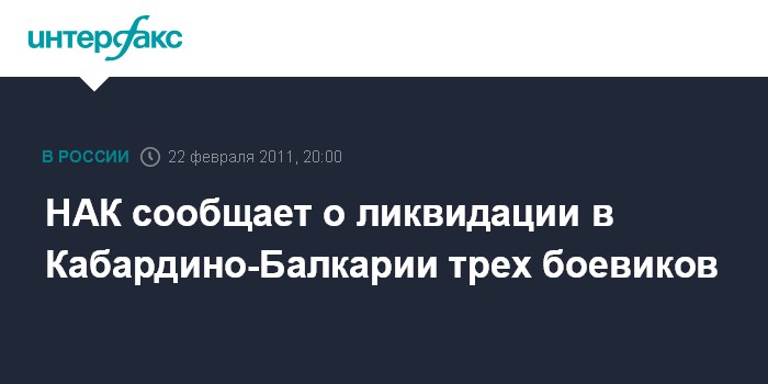 Москва. 22 февраля. INTERFAX.RU - Национальный антитеррористический комитет подтвердил уничтожение трех боевиков в Эльбрусском районе Кабардино-Балкарии.