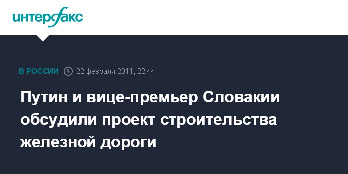 Москва. 22 февраля. ИНТЕРФАКС - Реализация крупного транспортного проекта в Европе обсуждалась в ходе состоявшейся во вторник в Москве встречи премьера РФ Владимира Путина с первым вице-премьером, министром транспорта, строительства и регионального развития Словакии Яном Фигелем.