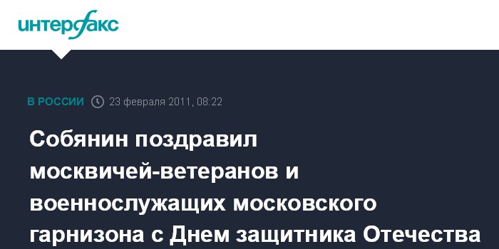 Москва. 23 февраля. ИНТЕРФАКС - Мэр Москвы Сергей Собянин поздравил москвичей-ветеранов Великой Отечественной войны и вооруженных сил, локальных войн и военных конфликтов, а также военнослужащих московского гарнизона с Днем защитника Отечества.
