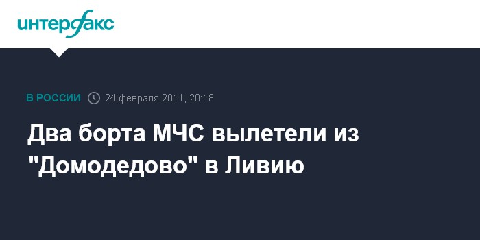 Москва. 24 февраля. INTERFAX.RU - Два самолете ИЛ-76 МЧС России вылетели в течение четверга из московского аэропорта "Домодедово" в ливийский город Сирт для эвакуации россиян.
