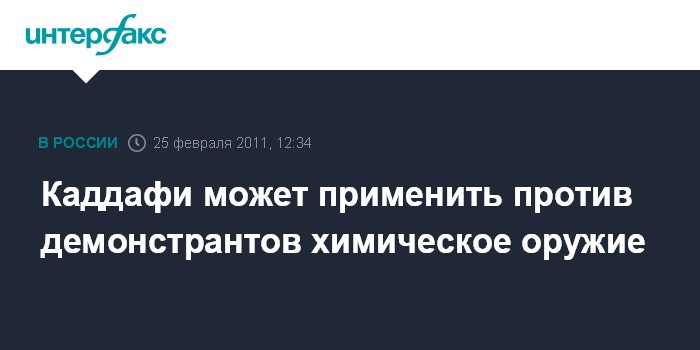 Дубай. 25 февраля. INTERFAX.RU - Ливийский лидер Муамар Каддафи, возможно, готов применить против участников акций протеста химическое и биологическое оружие, заявил бывший министр юстиции страны Мустафа Абдель Галиль в интервью межарабскому телеканалу Al-Jazeera.