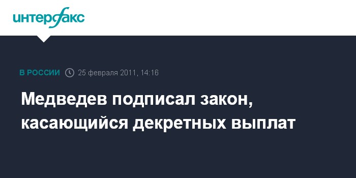 Москва. 25 февраля. INTERFAX.RU - Президент РФ Дмитрий Медведев подписал закон, которым регулируется порядок расчета пособия по беременности и родам, и ежемесячного пособия по уходу за ребенком.