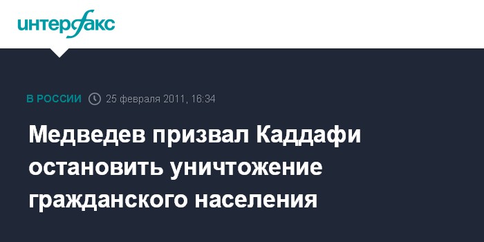 Санкт-Петербург. 25 февраля. INTERFAX.RU - Россия призывает власти Ливии не допустить дальнейшего ухудшения ситуации и уничтожения гражданского населения. В противном случае эти действия будут квалифицированы как преступление со всеми вытекающими отсюда последствиями, говорится в специальном заявлении президента РФ Дмитрия Медведева, обнародованном в пятницу.