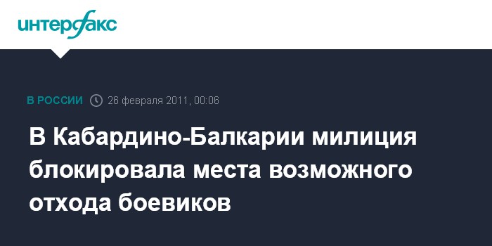 Нальчик. 26 февраля. ИНТЕРФАКС-ЮГ - В Кабардино-Балкарии блокированы места возможного отхода боевиков, напавших на объекты правоохранительных органов, сообщает пресс-служба МВД по республике.
