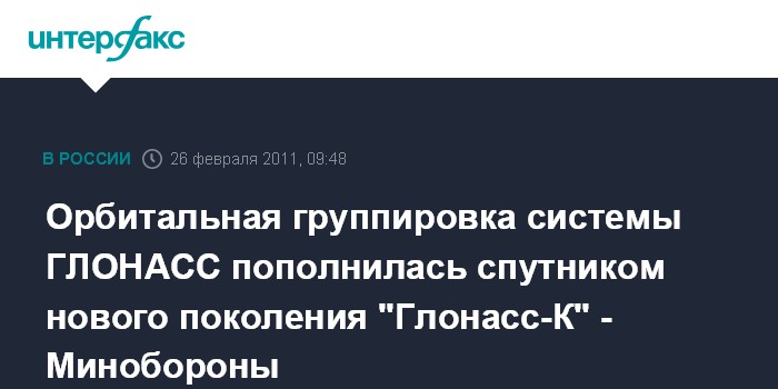 Плесецк/Москва. 26 февраля. ИНТЕРФАКС-АВН - Навигационный космический аппарат "Глонасс-К", выведенный на целевую орбиту, взят на управление Космическими войсками.