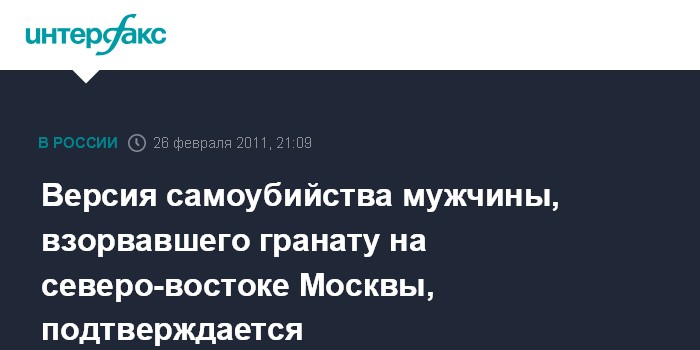 Москва. 26 февраля. ИНТЕРФАКС - Главное следственное управление СК РФ по Москве подтверждает версию самоубийства мужчины на северо-востоке Москвы.