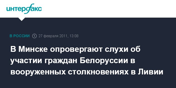 Минск. 27 февраля. INTERFAX.RU - Граждане Белоруссии не принимают участия в военных действиях на территории Ливии, заявили агентству "Интерфакс-Запад" в воскресенье в министерстве иностранных дел республики. "По информации МИД, белорусских граждан, действующих в каких-либо военных формированиях на территории Ливии, нет", - сказала заместитель начальника управления информации МИД Белоруссии Мария Ваньшина. "Слухи, распространяемые рядом СМИ, не соответствуют действительности", - отметила представитель МИД Белоруссии.
