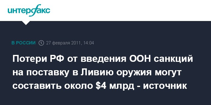 Потери РФ от введения ООН санкций на поставку в Ливию оружия могут составить около $4 млрд - источник