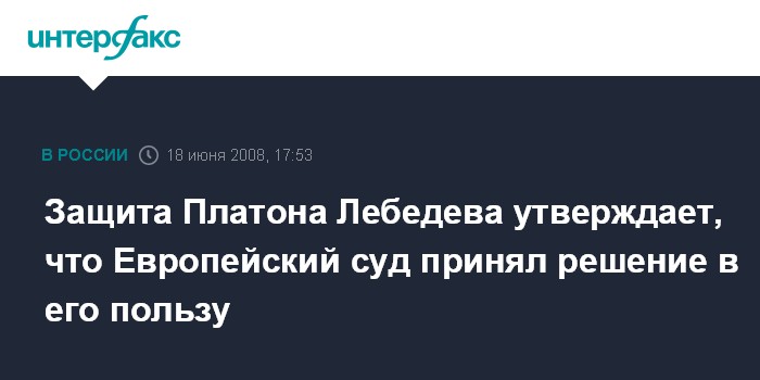 Москва. 18 июня. INTERFAX.RU - Решение Европейского суда о незаконном содержании под стражей руководителя МФО "МЕНАТЕП" Платона Лебедева вступило в силу, заявляют его защитники.