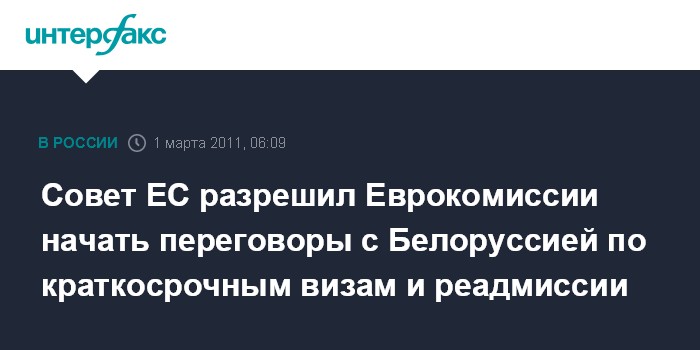 Брюссель. 1 марта. ИНТЕРФАКС - Совет ЕС принял два решения, разрешающих Европейской комиссии начать переговоры с Белоруссией о заключении соглашений по упрощению выдачи краткосрочных виз и о реадмиссии, говорится в постановлении Совета, распространенном в понедельник вечером в Брюсселе.