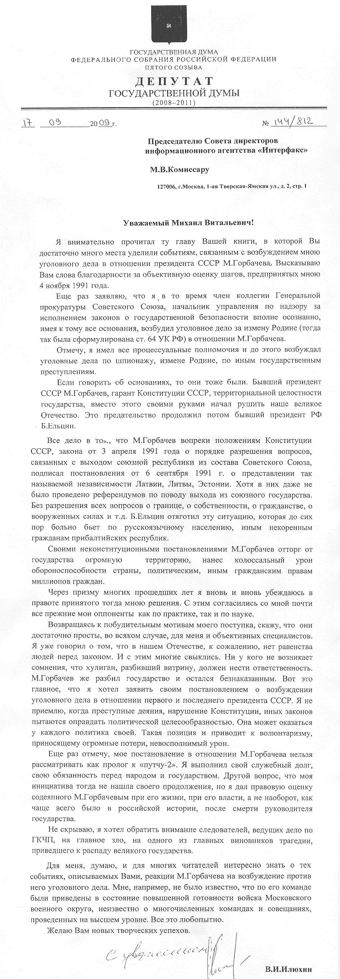 Фрагмент из официального письма депутата Государственной думы (2008-2011) В.Илюхина, направленного М.Комиссару многими годами позже описываемых событий, 17.09.2009