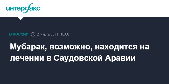 Каир. 2 марта. INTERFAX.RU - Бывший президент Египта Хосни Мубарак находится на лечении в одном из госпиталей в Саудовской Аравии, сообщает в среду египетская газета "Аль-Ахбар".